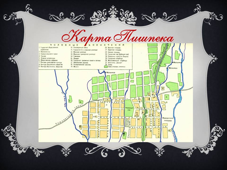 В 1878 году генерал - губернатором Г.А. Колпаковским был утвержден генеральный план застройки города. В плане закладывалась прямоугольная система улиц, более прогрессивная, по сравнению со средневековой планировкой, существовавшей в городах Центральной Азии. В том же 1878 году была произведена разбивка улиц, кварталов, площадей. Это был первый в Кыргызстане город европейского типа.
